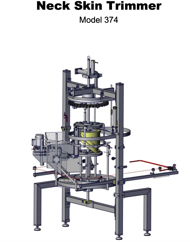 The Neck Skin Trimmer 374 is part of the evisceration line and driven by the overhead conveyor. The machine trims the neck skin after the neck has been removed. The Neck Skin Trimmer 374 firmly positions the birds using a leg loop and lifts the wings before trimming the skin. The wing lifting feature ensures free access for the knife to perform the neck skin cut without damaging the wings. The machine can be adjusted during operation by using one manual hydraulic jack to accommodate varying bird sizes.